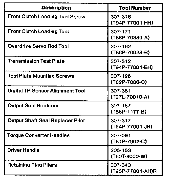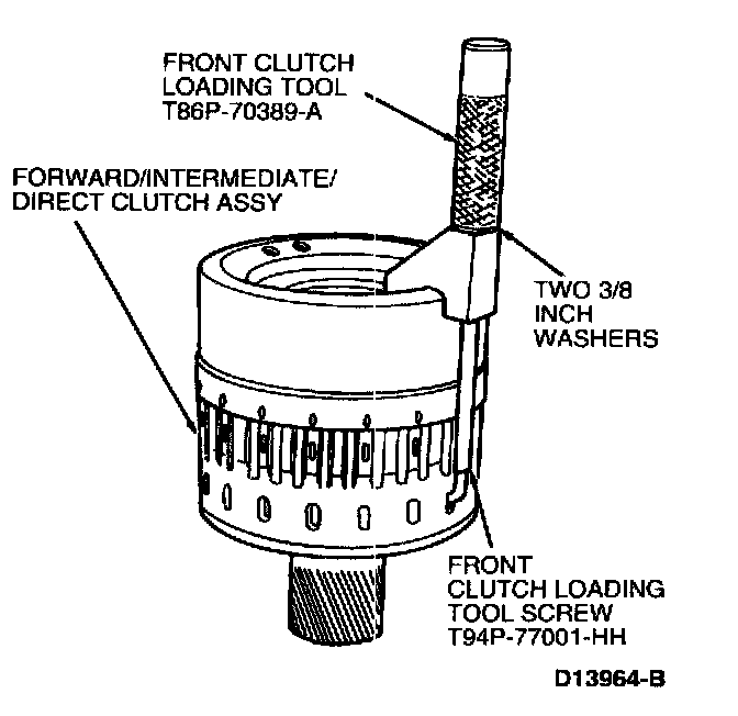 Place two 3/8 inch wasters between the Front Clutch Loading Tool 307171 (T86P-70389-A) handle and notched block Install Front Clutch Loading Tool Screw 307-316 (T94P-77001-HH) into Front Clutch Loading Tool 307-171 (T86P-70389-A). Install fool to forward/intermediate/direct clutch assembly.
