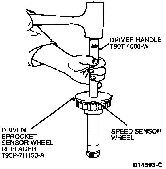3. If speed sensor wheel is damaged, replace it using Driven Sprocket Sensor Wheel Replacer T95P-7H150-A with Driver Handle T80T-4000-W.
