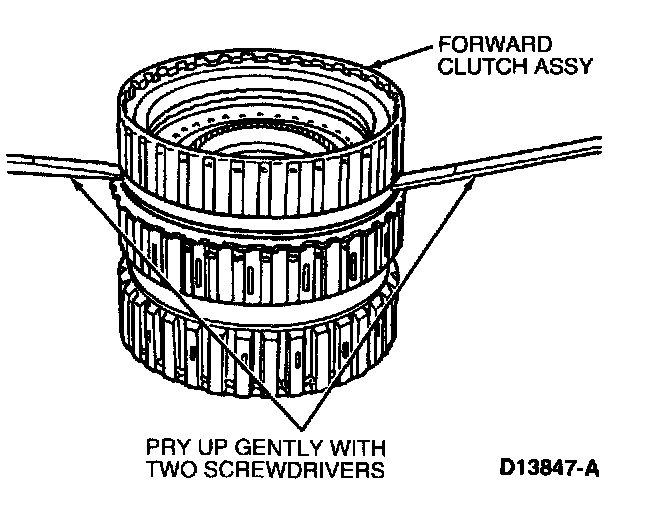 Remove forward clutch assembly by prying up on each side with two screwdrivers.