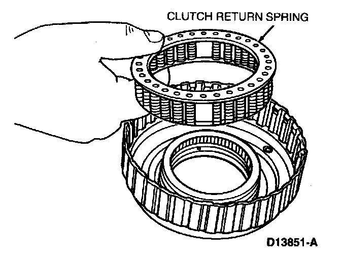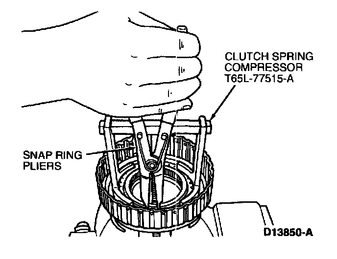 Install clutch return spring using Clutch Spring Compressor T65L-77515-A. Use snap ring pliers to install the retaining ring.
