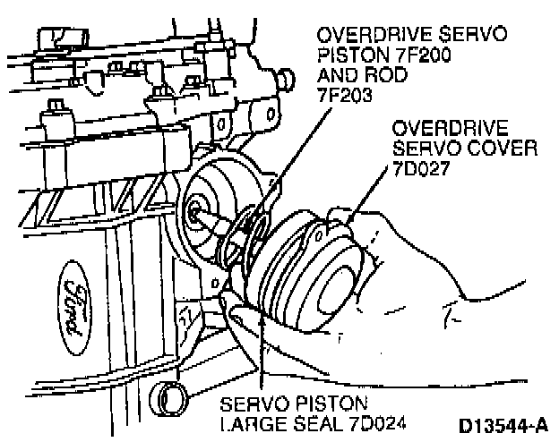 NOTE: Piston assembly and spring may remain in cover. Remove overdrive servo cover bolts, cover, piston assembly and spring.