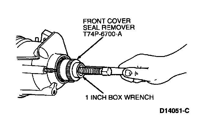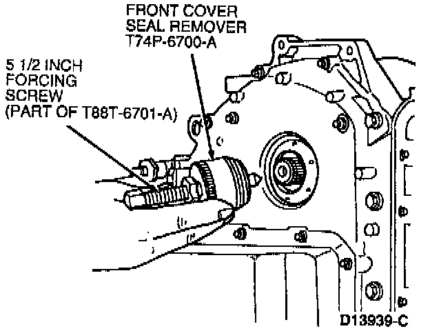 13. Install Front Cover Seal Remover 303-107 (T74P-6700-A) and forcing screw into seal using a one-inch box wrench.