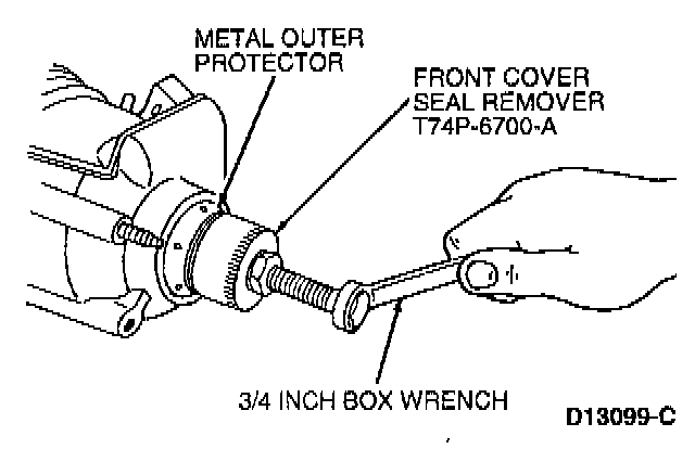 b. Screw Front Cover Seal Remover 303-107 (T74P-6700-A) and 5 1/2-inch forcing screw (from tool kit 303-335 (T88T-6701-A)), into outer metal protector using a one-inch box wrench.