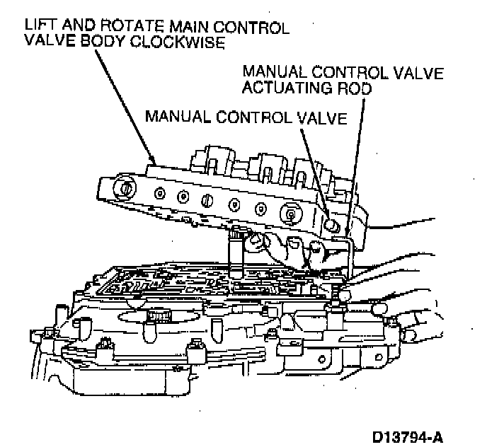 Rotate main control valve body clockwise. Remove manual control valve actuating rod from manual control valve and remove main control valve body and gasket.