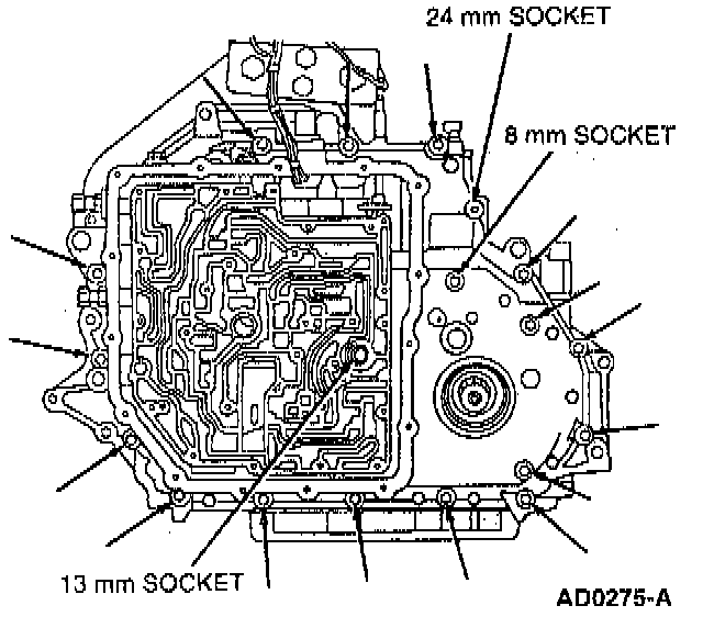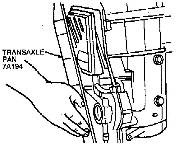 27. Remove 19 transaxle pan bolts. Remove transaxle pan and gasket.