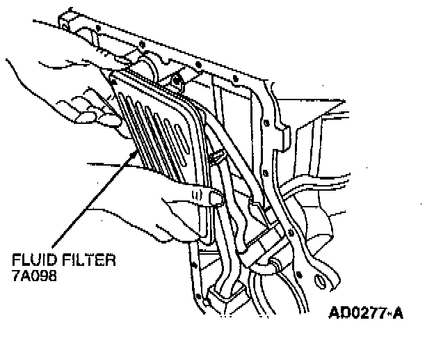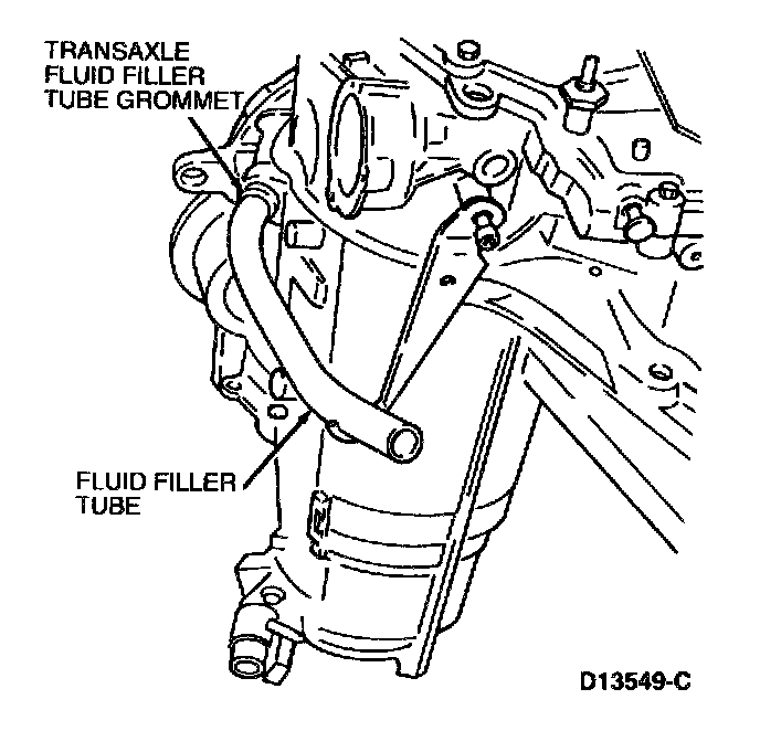 6. Remove transaxle filler tube retaining bolt and pull fluid filler tube from case. Remove and discard tube-to-case grommet.