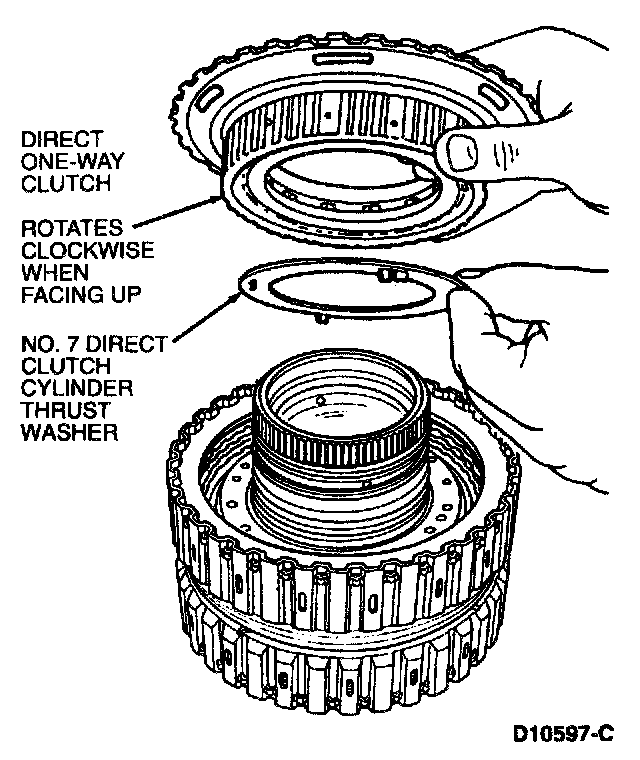 1. Place direct/intermediate clutch cylinder with intermediate clutch facing down.2. Install No. 7 thrust washer into direct clutch being sure tabs are aligned with slots in direct clutch.