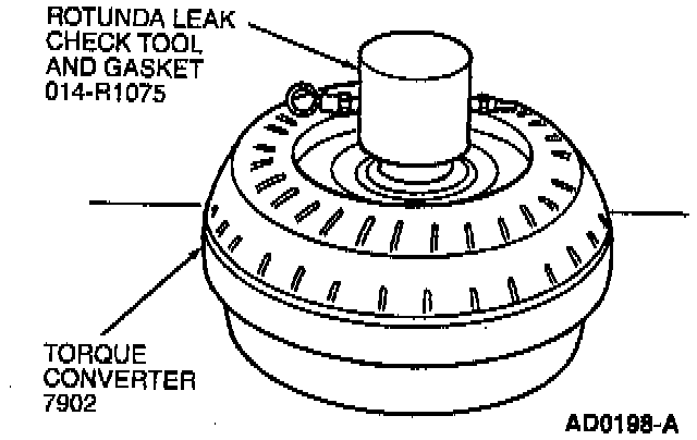 10. With air pressure applied to the torque converter, inspect for leaks at the seams and impeller hub. A soapy water solution may be used in these areas to aid in diagnosis. If leaks are present in these areas replacement of the torque converter is necessary.