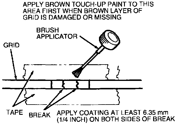 If both brown and silver layers of grid are broken or missing, apply a coating of the dark walnut metallic Acrylic Lacquer Touch-Up Paint AL8 1-5858-B or equivalent meeting Ford specification EAR-M2P1OO-B across break area first. Two coats may be necessary to obtain proper color. Allow touch-up paint to dry. Then apply three coats of grid repair compound, allowing three to five minutes drying time between coats. The coating of grid repair compound must extend at least 6.35 mm (1/4 inch) on both sides of break area.