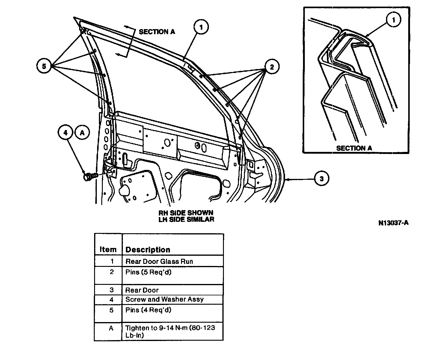 7. Position rear door window glass at its lowest point. Install rear door glass run mounting bolt and tighten to 7-10 Nm (62-88 lb-in).