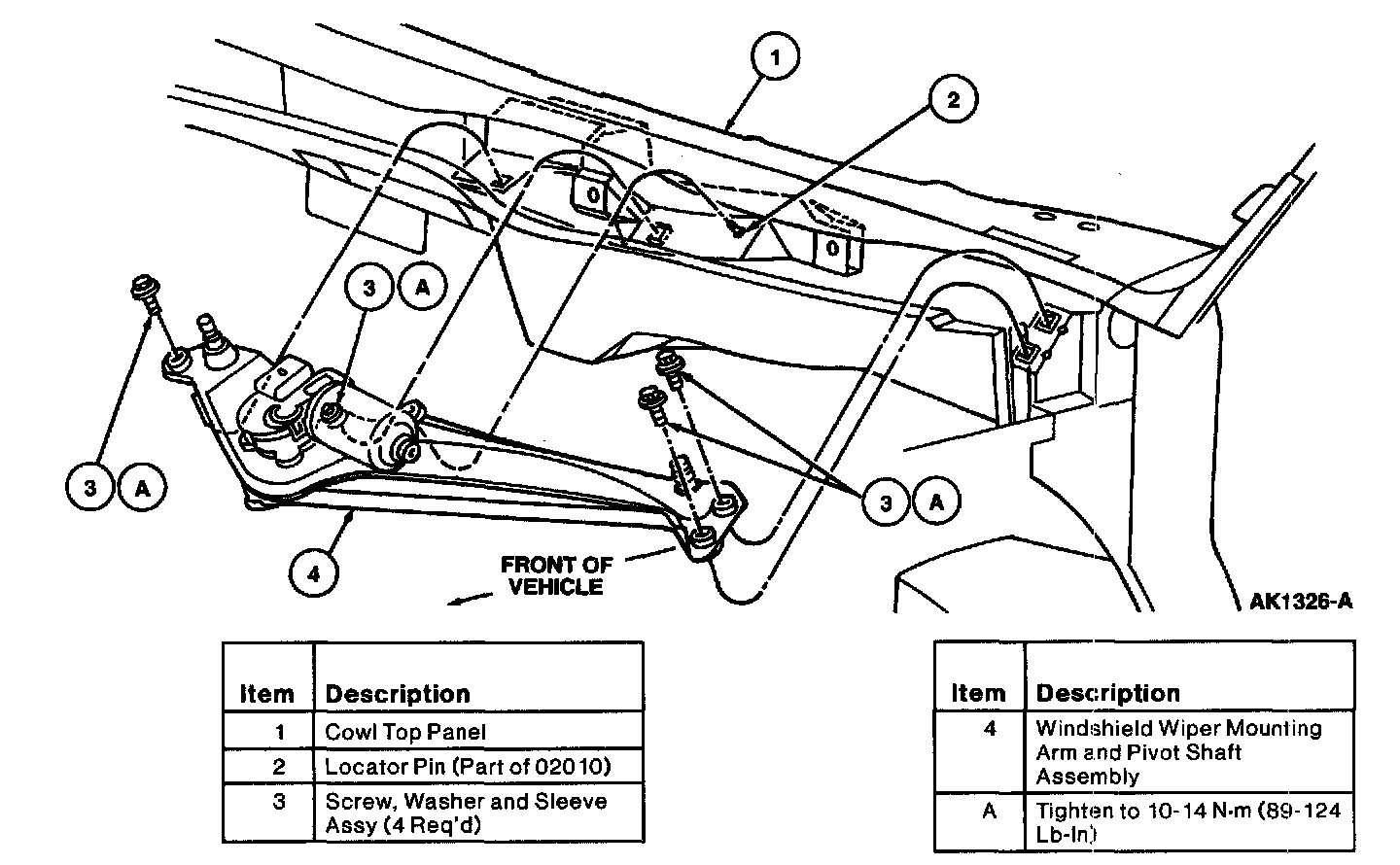 2. Tighten screws retaining windshield wiper mounting arm and pivot shaft assembly to 10-14 Nm (89-124 Lb-In).