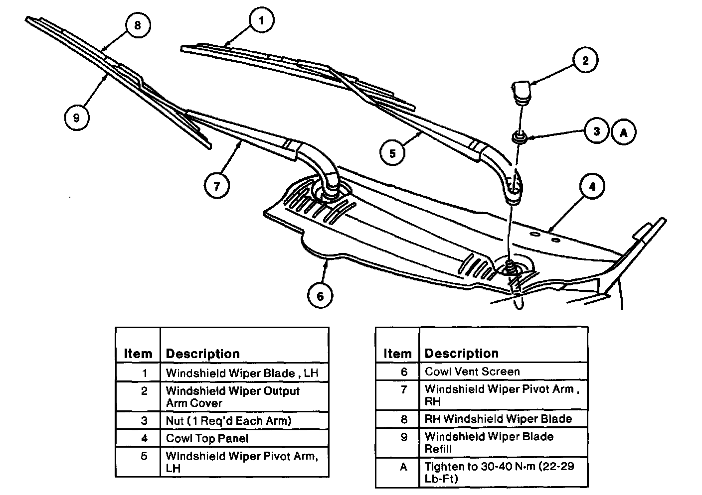 3. Install nut retaining windshield wiper pivot arm to pivot shaft and tighten to 30-40 Nm.