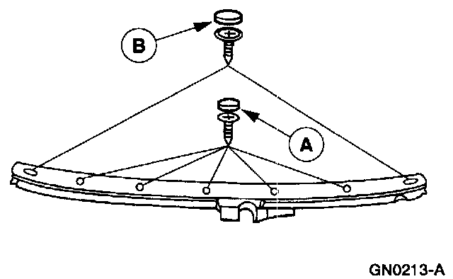 ^ Remove the (A) center cowl top vent grille retainers and screws, and the (B) outer cowl top vent grille retainers, screws, and washers.