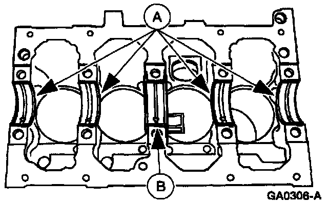 1. Install the (A) upper crankshaft main bearings and the (B) crankshaft thrust main bearing.