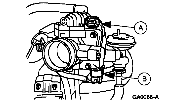 45. Connect the (A) idle air control valve and the (B) throttle position sensor electrical connectors.