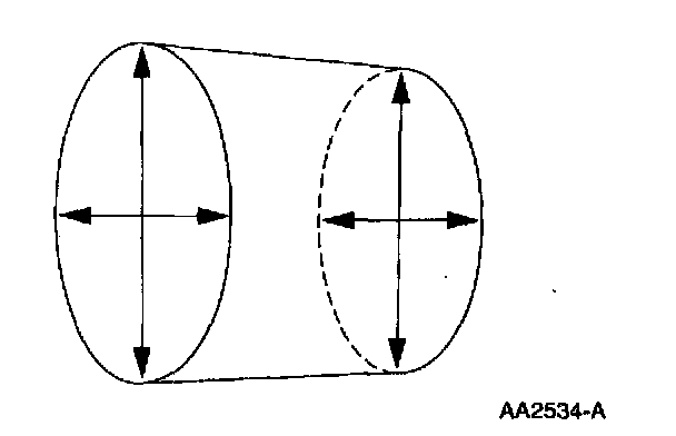 1. Measure the crankshaft connecting rod journal diameters in two directions perpendicular to one another at each end of the connecting rod journal. The difference in the measurements from one end to the other is the taper. Verify the taper is within the wear limit.