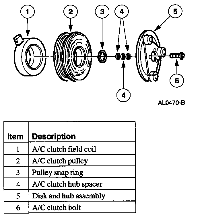NOTE:- Internal A/C compressor components are not repaired separately. The FS-10 A/C compressor is serviced only as an assembly. The A/C clutch, A/C clutch pulley, A/C clutch field coil and the shaft seals are repairable.