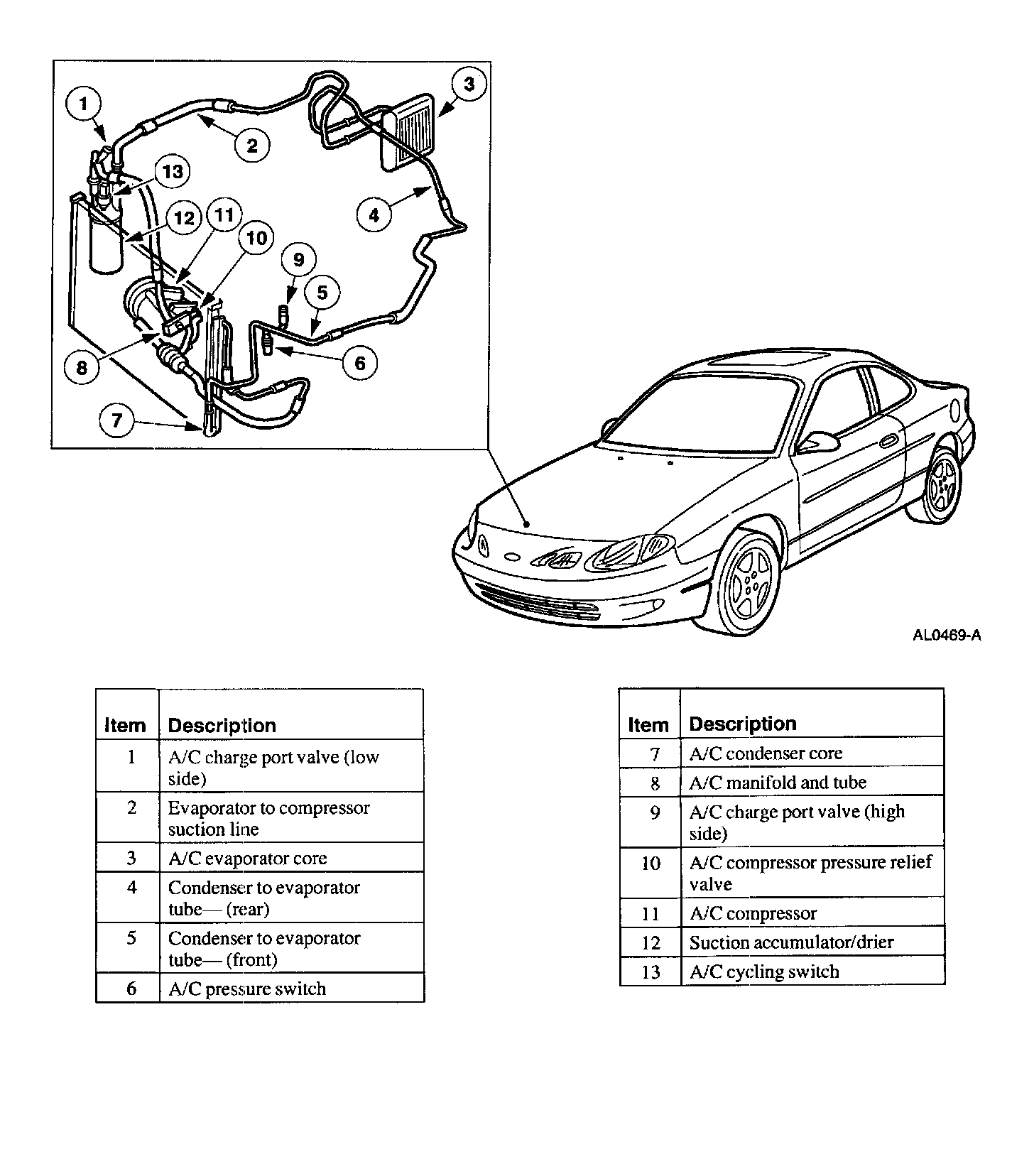 The A/C refrigerant system is a clutch cycling orifice tube type. The system components are: