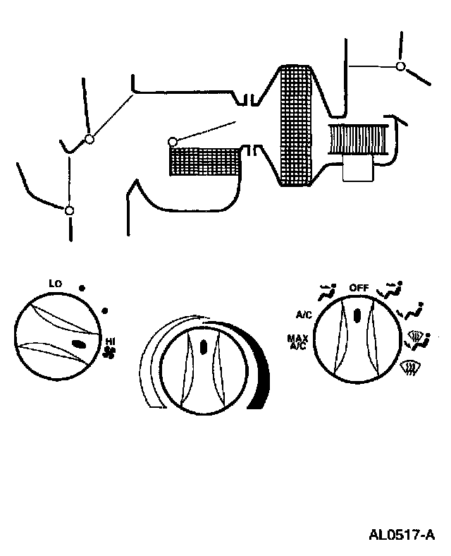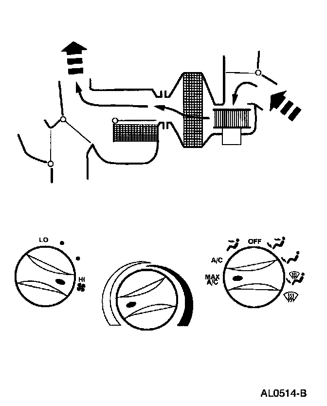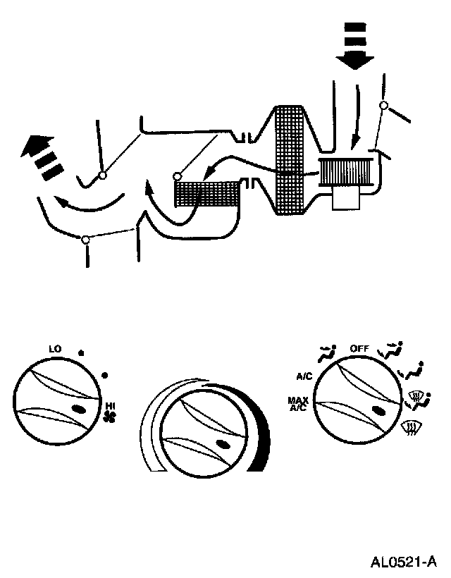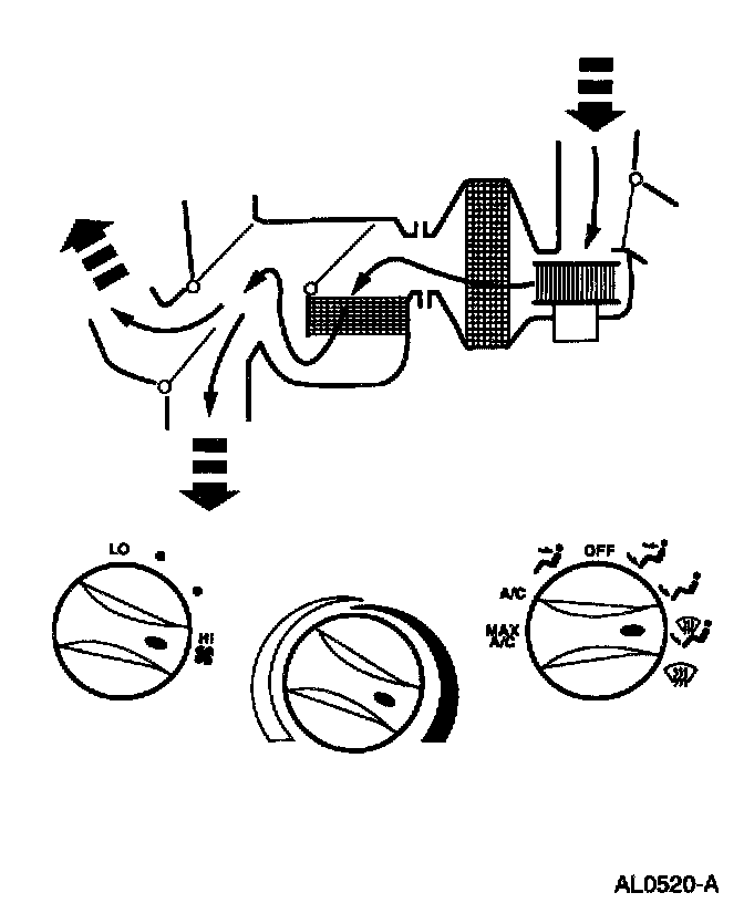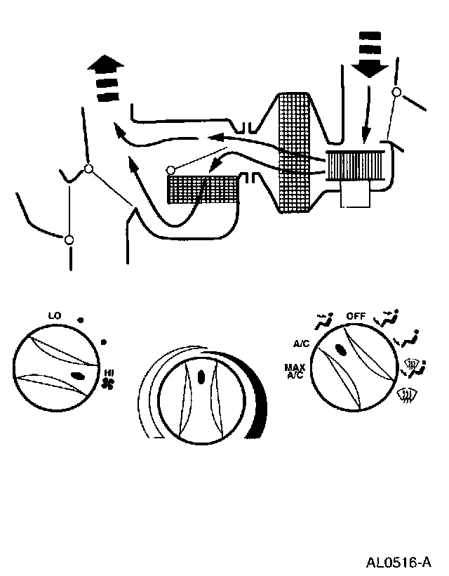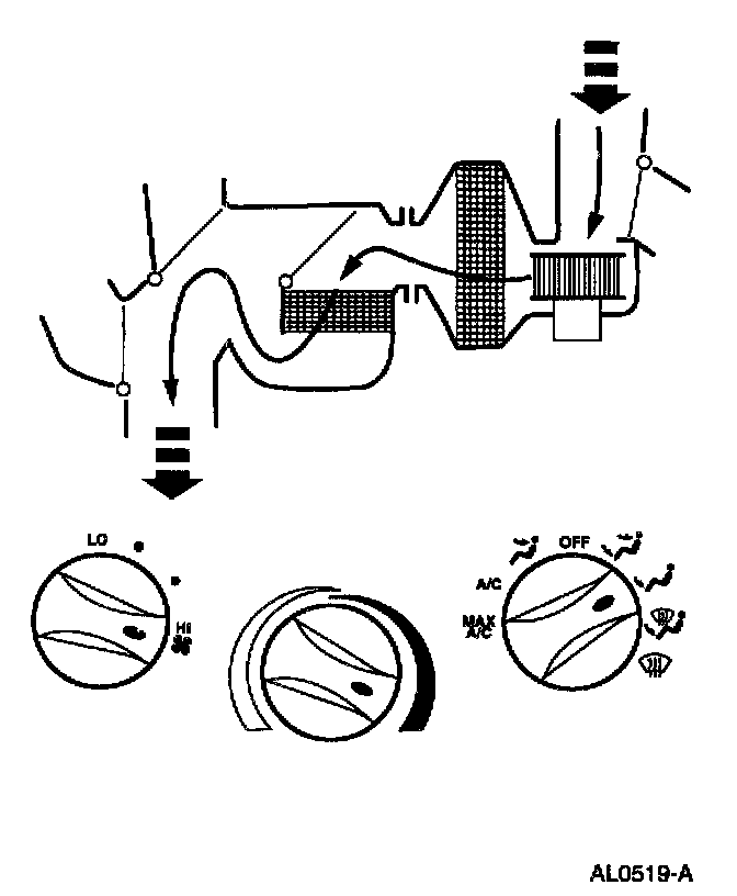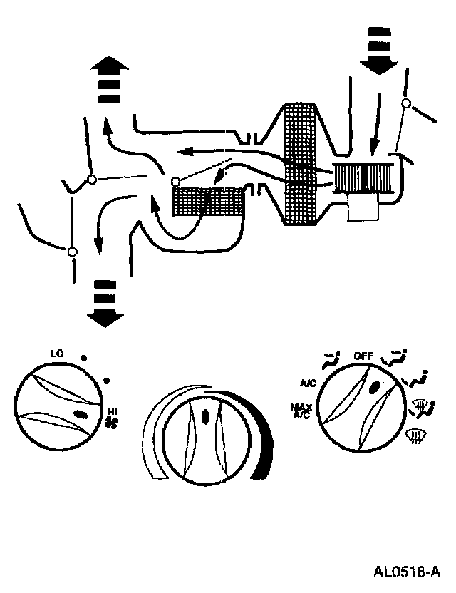 - Air will be picked up at the recirc opening by the blower motor. With the temperature control set for maximum cold, airflow across the A/C evaporator core will be diverted past the heater core and then directed into the passenger compartment through the instrument panel A/C registers.