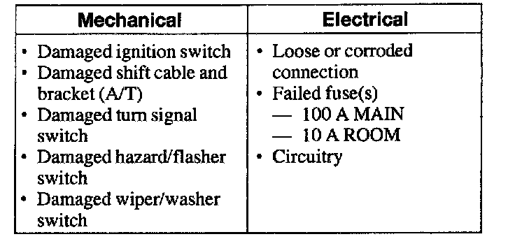 1. Verify the customer concern by operating the ignition switch and the multi-function switch housing with switches attached.Visual Inspection Chart: