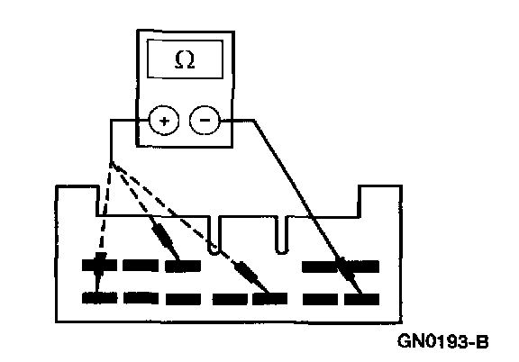 2. Measure resistance between the power door lock relay, terminal 5, and the power door lock relay terminals.