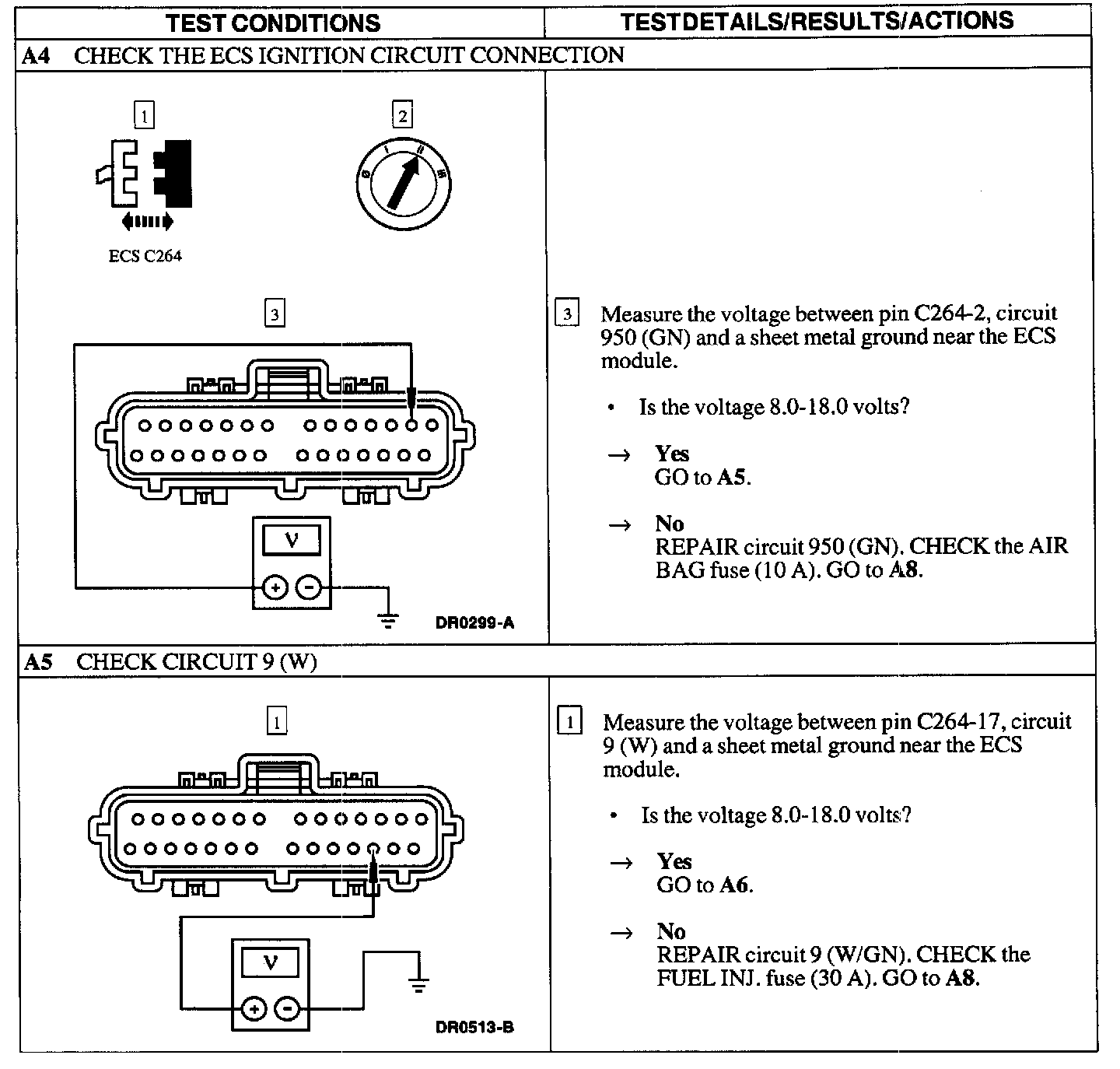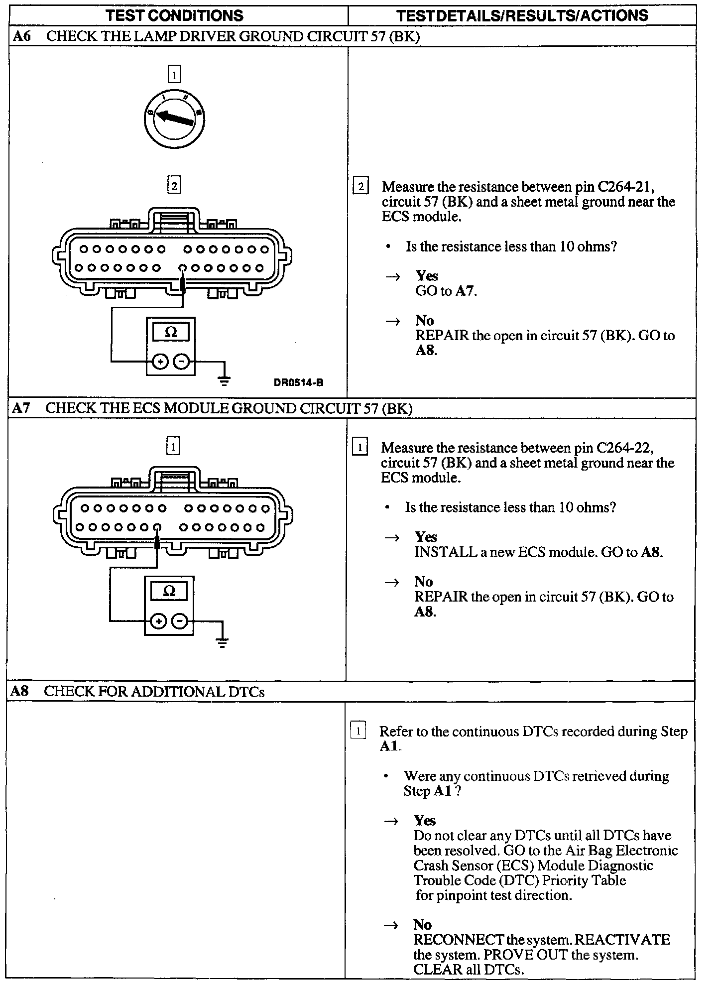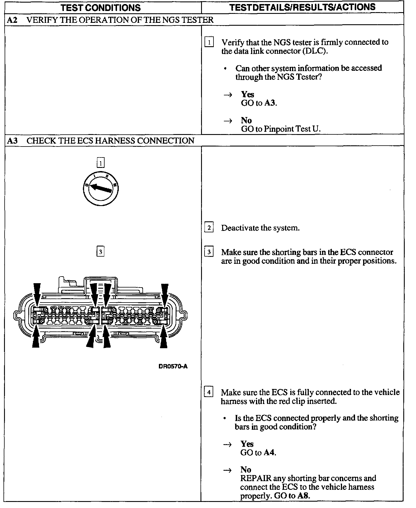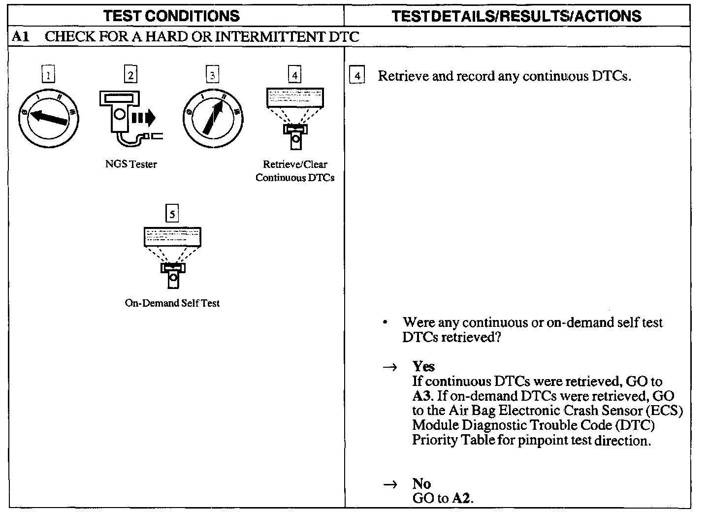 Normal OperationThe air bag Electronic Crash Sensor (ECS) module will communicate Diagnostic Trouble Codes (DTCs) through the New Generation Star (NGS) Tester using the Data Link Connector (DLC). If the NGS Tester displays NO COMMUNICATION when retrieving continuous DTCs, use this pinpoint test to troubleshoot the system.