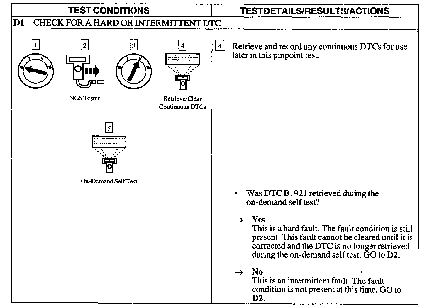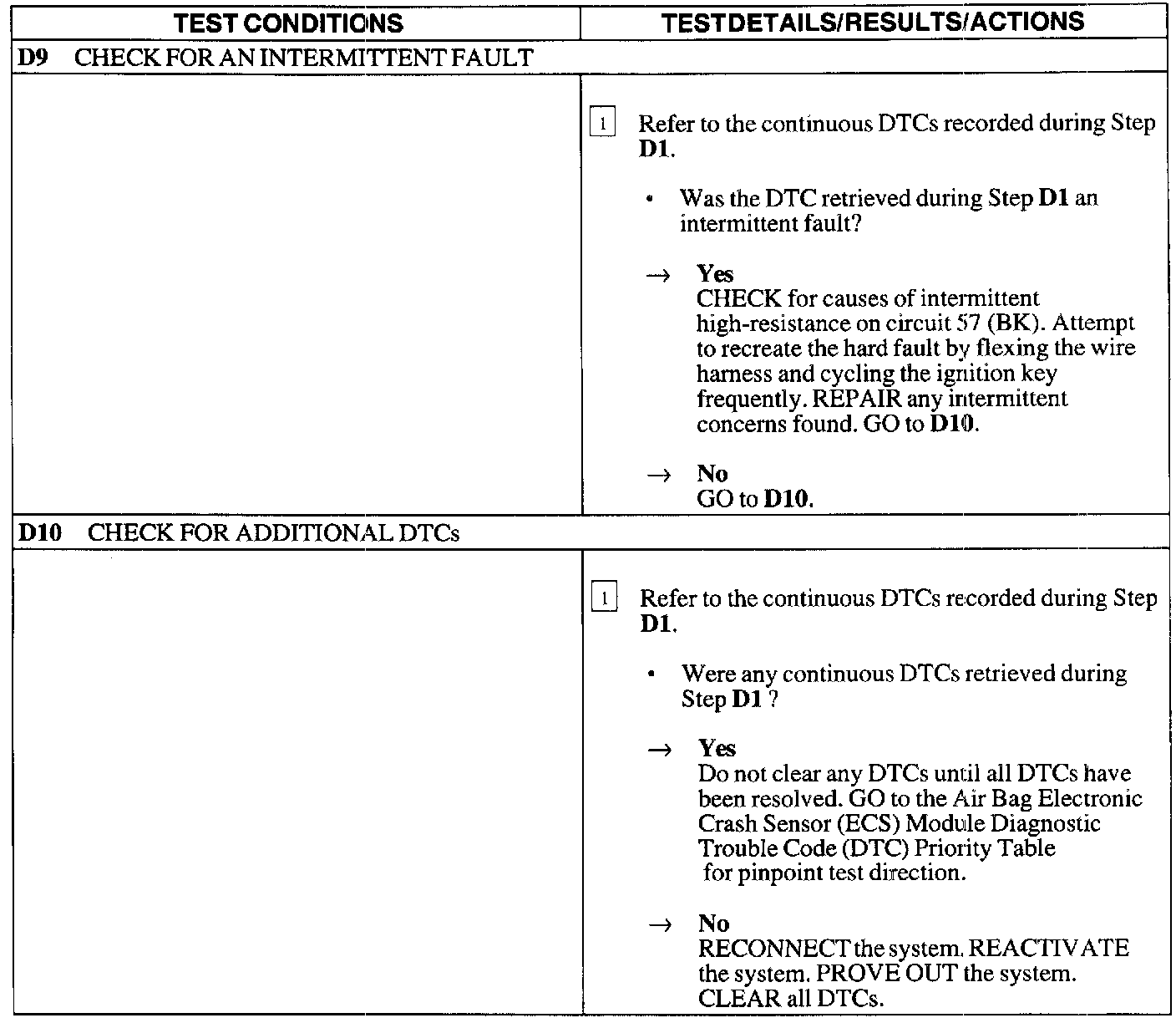 Normal OperationThe air bag Electronic Crash Sensor (ECS) module monitors the resistance between the ground connections at its housing and the reference ground at Pins 21 and 22. If the ECS detects a resistance greater than 100 ohms, it will store a Diagnostic Trouble Code (DTC) B1921 in memory and flash a Lamp Fault Code (LFC) 21 (or higher priority code if one exists) on the air bag indicator.