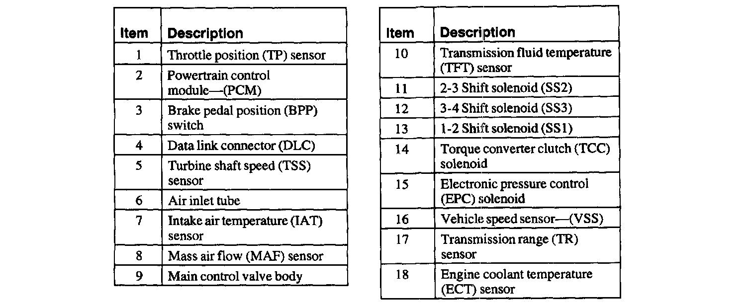 The Transmission Fluid Temperature (TFT) sensor is a two-wire thermistor that is part of the main wiring harness. It receives a voltage signal which is reduced by the resistance of the sensor in accordance with temperature. The signal is then sent to the PCM which interprets the voltage signal to determine transmission fluid temperature.