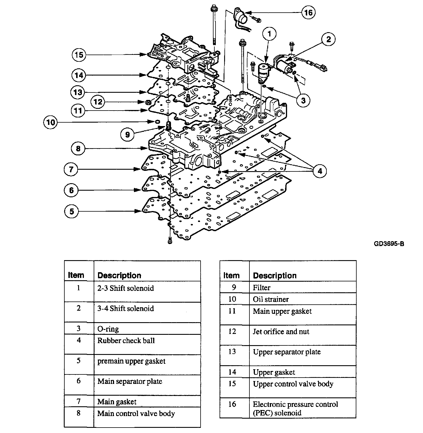 7. Remove the (A) upper gasket, (B) upper separator plate, (C) filter, and the (D) main upper gasket.