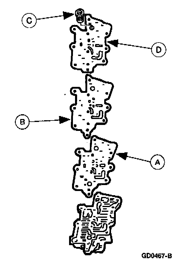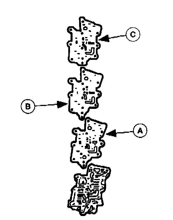 15. Install a new (A) upper gasket, (B) upper separator plate, and a new (C) main upper gasket onto the upper control valve body.