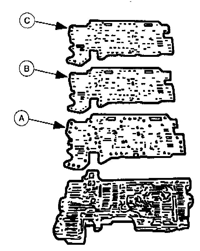 4. Set the new (C) lower gasket, (B) lower separator plate and a new (A) premain lower gasket onto the lower valve body.