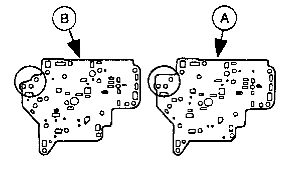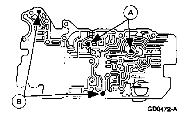 12. Remove the (A) rubber check balls and the (B) oil strainers from the premain control valve body.