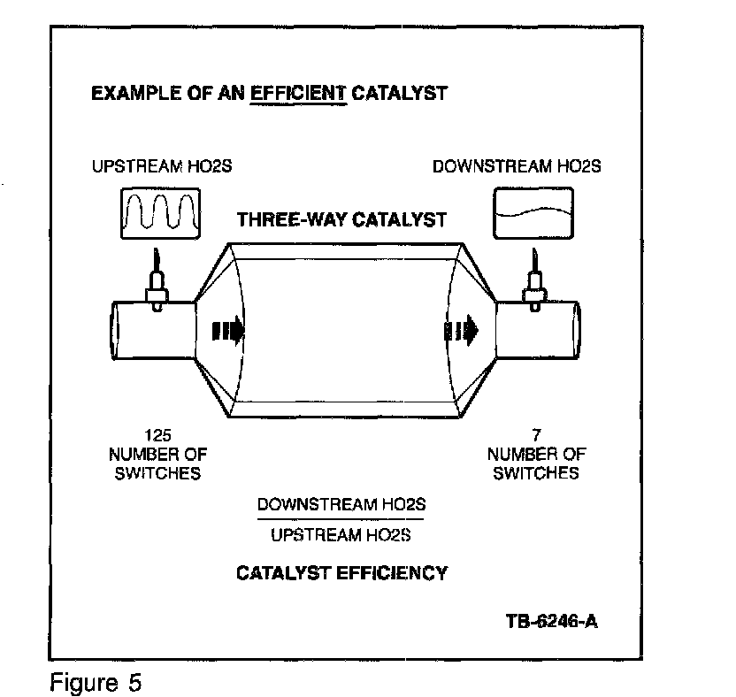 The upstream H025 sensors will have a high switch frequency, due to normal closed loop fuel control. With an efficient catalyst, the downstream H025 will have a low switch frequency. The switch ratio is determined by dividing the number of downstream switches by the number of upstream switches over a given period of time. As the catalyst ages (or if the catalyst is damaged or contaminated), the downstream switches will increase. When the downstream switch rate crosses a threshold value (approximately 0.75 switch ratio), a code is stored (P0420 and/or P0430) and the MIL illuminates (refer to Figures 5 and 6).