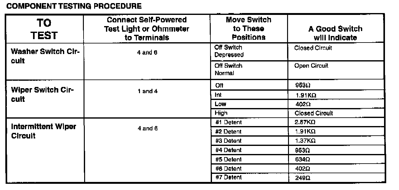 The component connector MUST BE REMOVED before testing. To test a single circuit within the component, select that circuit under the column TO TEST. If you wish to test the complete component, perform all tests.