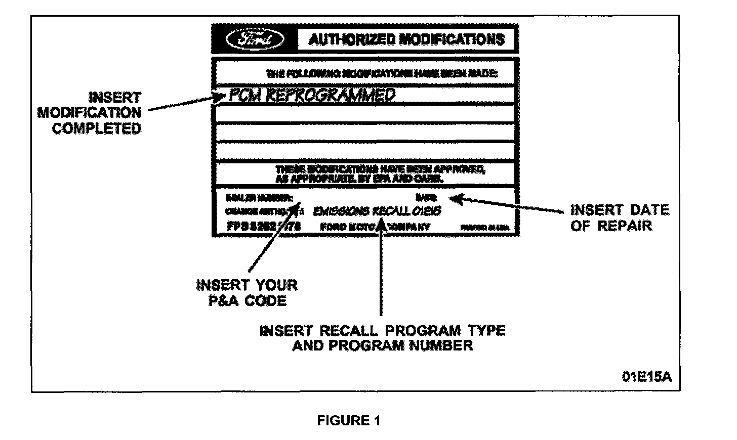 1. Obtain and prepare the Authorized Modifications Label. Write the modification completed, your P&A Code, date of repair and the recall program type and program number. See Figure 1.