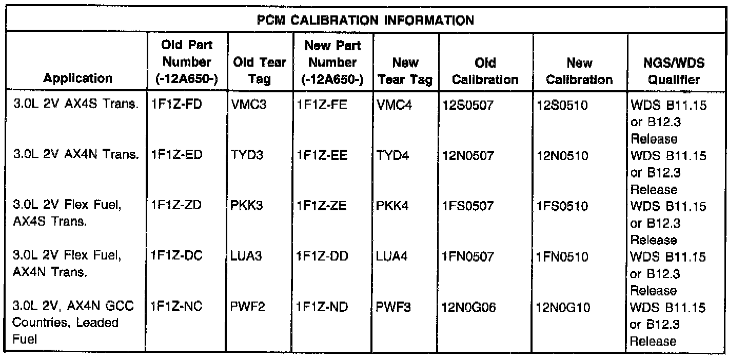 IF USING A NEW GENERATION STAR (NGS) TESTER TO REPROGRAM THE PCM, THE NGS MAY ASK "WOULD YOU LIKE TO MODIFY ANY PCM PARAMETERS?" ANSWER "NO" TO THIS QUESTION. THIS WILL PREVENT CHANGES TO THE TIRE SIZE AND AXLE RATIO. IF "YES" WAS INADVERTENTLY SELECTED, IT MAY BE NECESSARY TO ENTER 797 FOR TIRE SIZE AND 3.47 FOR THE FINAL DRIVE AXLE RATIO.