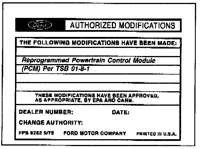 Obtain an Authorized Modifications Decal (FPS 8262 - obtainable through DOES II, 25/pkg) and list the date, dealer number, and summary of modifications performed. Select a prominent place adjacent to the Vehicle Emission Control Information Decal suitable for installing the Authorized Modifications Decal. Clean the area, install the decal, and cover it with a clear plastic decal shield.