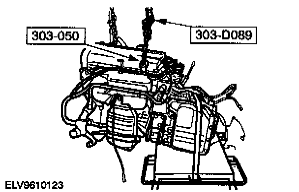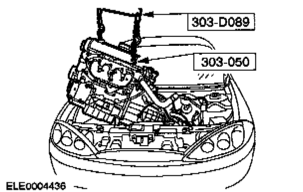 57. Install the special tools 303-050 and 303-D089. Using the special tools, engine lifting eyes and a Suitable Floor Crane, raise the engine/transaxle assembly slightly to remove the pressure from the support insulator.