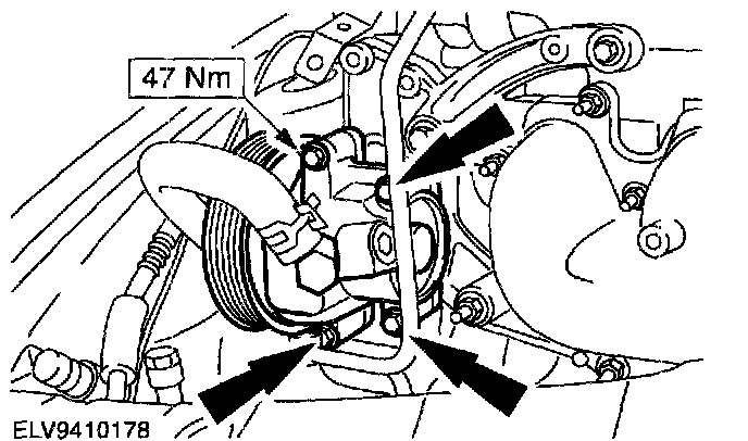 Raise the engine/transaxle assembly, until the power steering pump is accessible. Remove the power steering pump bolts and position the pump with mechanics wire to one side.