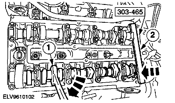 ^ Insert special tool 303-465 into the camshafts; if necessary loosen the timing pulleys and correct the camshaft alignment.