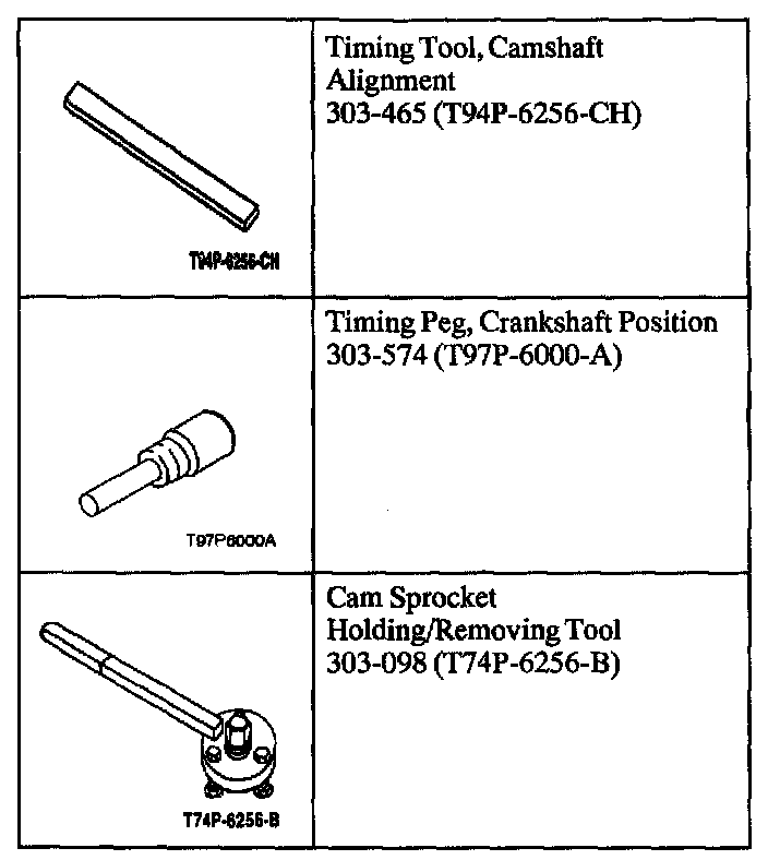Timing BeltNOTE: Ford does not provide camshaft gear timing marks, or information to perform timing belt service without the special tools shown in this procedure.
