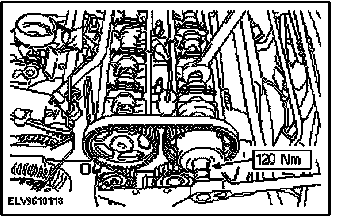 Tighten the exhaust camshaft pulley bolt to stage 2 (120 Nm).