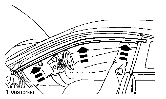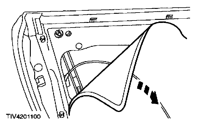CAUTION: The door weatherstrip is attached with a small amount of adhesive at the waste line of the B-pillar. To prevent damage to the weatherstrip, start removing the weatherstrip at the B-pillar waste line in an upward and forward direction.