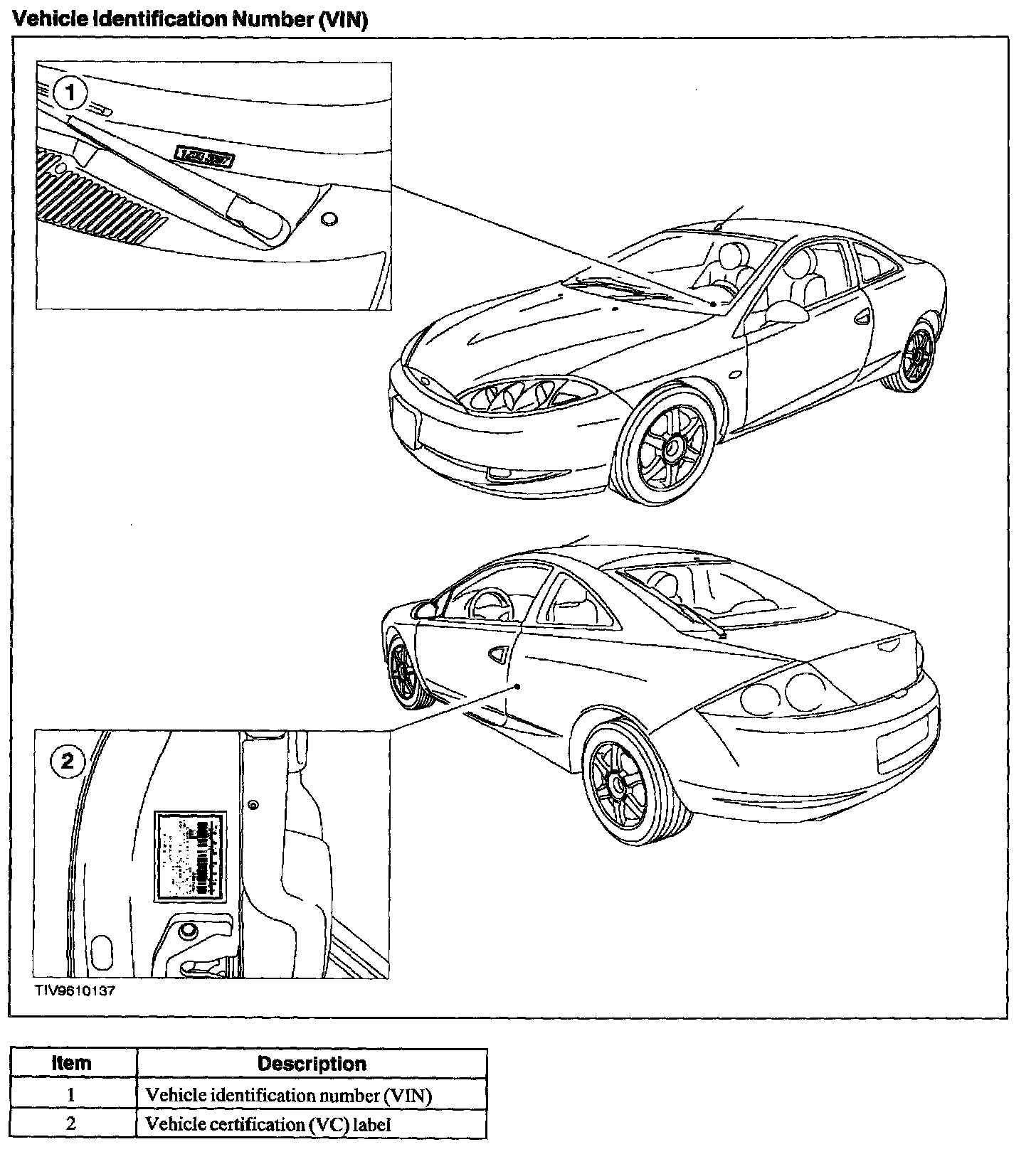 The Vehicle Identification Number (VIN) is a seventeen-digit alphanumeric code. The VIN is stamped on a metal tab riveted to the instrument panel, top upper left of the dash. The VIN is also found on the Vehicle Certification (VC) label.
