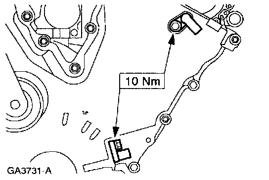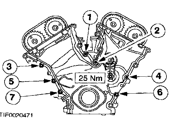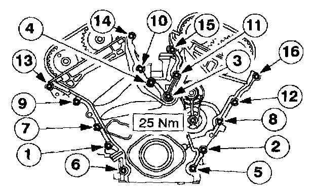 ^ First tighten the seven bolts and studs one quarter turn (90 degrees after the engine front cover contacts the cylinder block and the cylinder heads.
