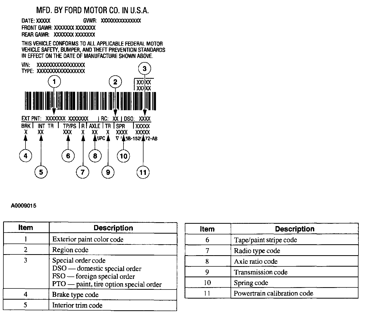 Powertrain calibration information is printed in the lower right corner of the Vehicle Certification Label. Only the base calibration information is printed. Revision levels will not appear, however, they can be found in On Line Automotive Service Information System (OASIS). For the current model year, Ford Motor Company is using three different protocols which describe powertrain base calibration. These protocols are designed to provide worldwide standardization for vehicle calibration. If the electronic calibration strategy has been used since 1998 and carried into the current model year, Protocol 1 will be used. Refer to Protocol 1. If the electronic calibration strategy has been used since 1999 and is carried into the current model year, Protocol 2 will be used. Refer to Protocol 2. For electronic calibration strategies introduced since the 2000 model year, Protocol 3 will be used. Refer to Protocol 3.