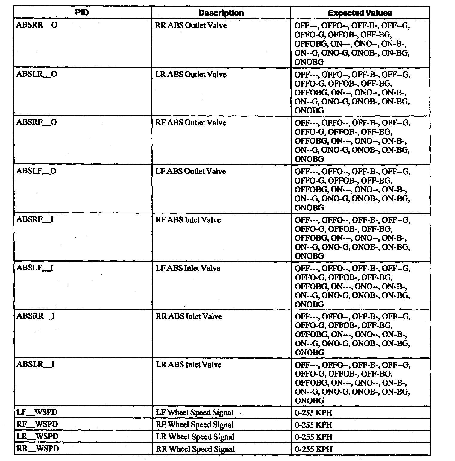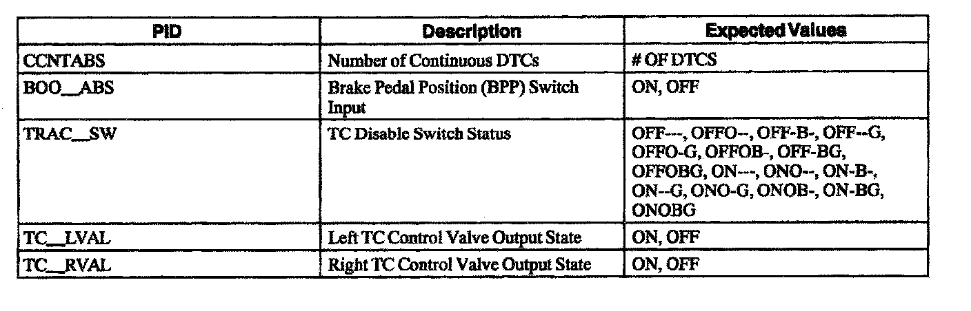 ABS Control Module Parameter Identification (PID) Index