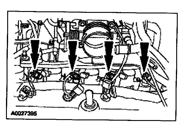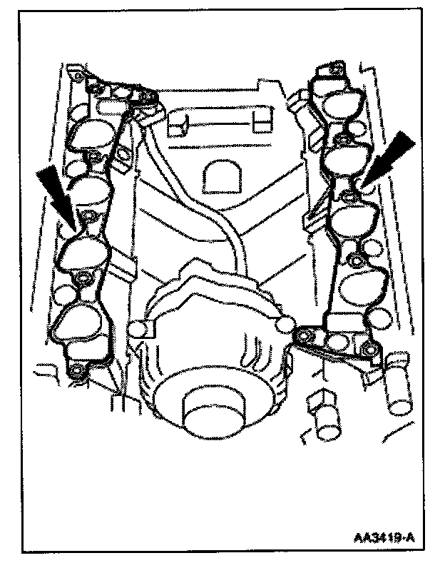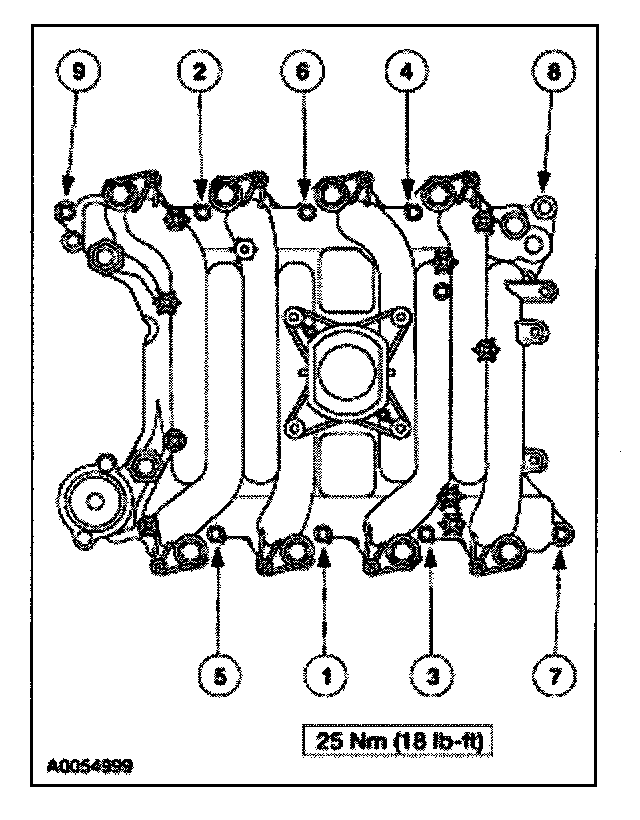 57. Install the intake manifold and hand-tighten the bolts at the locations shown.