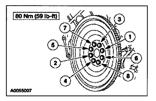 105. Position the flexplate and install the bolts in the sequence shown.