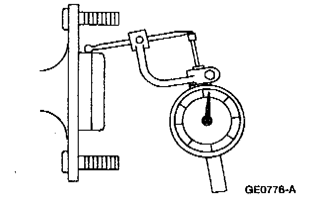 2. Rotate the hub or flange until the next bolt is contacted. Record the measurement and continue until each bolt is checked. The difference between the maximum and minimum contact readings will be the total wheel hub or axle flange bolt pattern runout. The runout must not exceed 0.38 mm (0.015 inch).